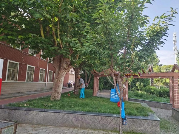 过程中,工作人员不顾天气的炎热,采用“人机结合”的方式对绿化带内杂草进行清理,同时对生长不规则的绿植进行修剪维护,确保绿植整齐美观。随后,工作人员将修剪下来的绿叶、粉碎草屑以及绿化带内垃圾进行统一清扫并清运。