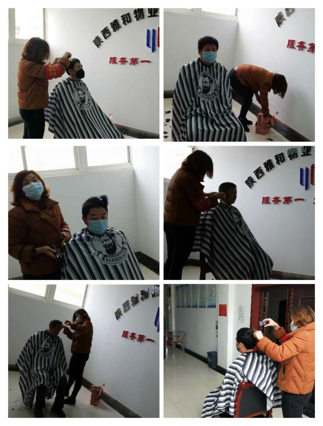 2月20日下午,公司辖区门面房“花艺剪”理发店老板李小花,自发携带理发工具来到了雅和物业办公室,免费为公司职工理发。她说:“疫情防控近一个月,大家都非常辛苦,你们守护了全小区居民生命安全和身体健康,我代表小区居民为你们干点事情,给大伙免费理个头发。”李老板的理发手艺众所周知,大家互相协调好手上的工作,逐个回到办公室修剪头发。经过理发师的一番辛苦劳作,个个瞬间精神了许多,纷纷对李老板表示感谢,对她疫情期间为大家免费理发的爱心义举表示赞许。