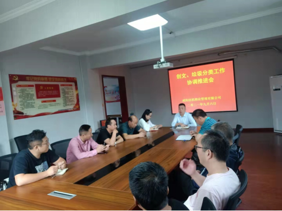 2021年9月6日上午10:00,纺机物业召开创文、垃圾分类协调推进工作会,会议由公司总经理常富淇主持,创文工作主管领导及各小区服务站管理、工作人员参加会议,
