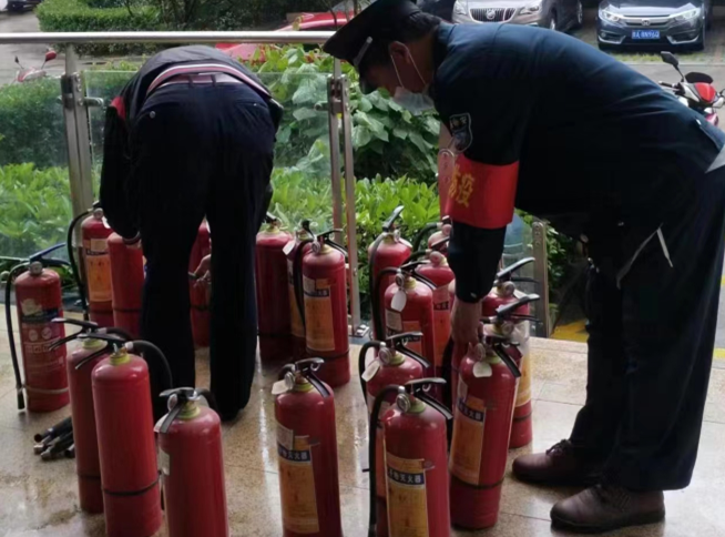 各项目工作人员在更换灭火器前期,对小区消防器材进行全面排查,主要对楼层通道、设备机房等重点部位的消防器材进行严格排查,逐个对消火栓进行试水和保养,对每一具灭火器都认真查看,看是否有生锈、失压、破损及是否在保质期内等,各项目排查后,对存在的问题及时上报公司,公司统一购买进行维修和更换。灭火器材是消防工作、安全措施的有力保障,所以使用、检查、保养、定期更换灭火器尤为重要。