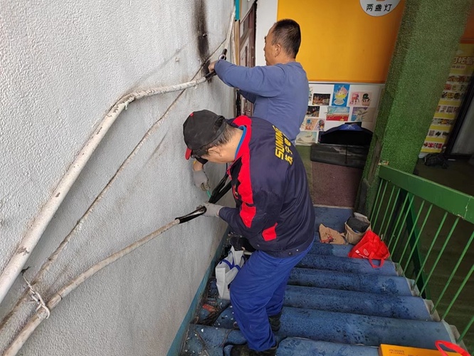 10月5日,正是国庆假期,维修班的电话突然响起,有居民反映1号楼附楼2层室外电线有打火现象,并伴随巨大声响。物管部值班人员迅速赶赴现场,初步判断为社区医院供电的线路老化,为了不影响社区医院正常运营,他们随即展开抢修。